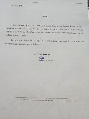 Aparegio Gorj S.A. – CED NOVACI anunţă întreruperea furnizării apei potabile începand cu data de 03.12.2025, in localitatea BAIA de FIER, sat CERNADIA, ca urmare a lucrărilor de identificare a surselor alternative de apa care comunica cu reteaua publica de apa potabila .